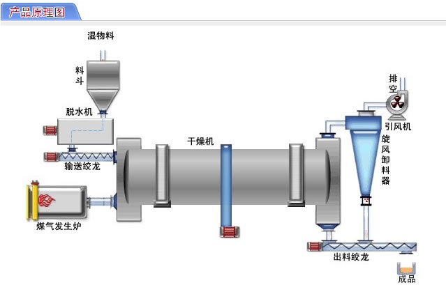 豆渣烘干機(jī)主要由供熱源、進(jìn)料機(jī)、回轉(zhuǎn)滾筒、出料機(jī)、引風(fēng)機(jī)、卸料器和配電柜構(gòu)成;脫水后的濕豆渣進(jìn)入烘干機(jī)后,在滾筒內(nèi)均布的抄板翻動下,在烘干機(jī)內(nèi)均勻分散與熱空氣充分接觸,加快了烘干傳熱﹑傳質(zhì)。在烘干過程中,豆渣在帶有傾斜度的抄板和熱介質(zhì)的作用下,至烘干機(jī)另一段星形卸料閥排出烘干成品。在方案設(shè)計(jì)當(dāng)中、充分考慮到豆渣水分含量大、蛋白含量高、粘性大的特點(diǎn),并采取了系列合理的技術(shù)和工藝來加以解決,以確保良好的烘干效果。
